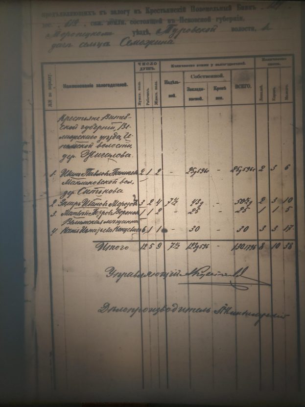 В делах центрального отделения Крестьянского поземельного банка (РГИА ф.592) можно найти не только ФИО заемщиков и экономическое описание покупаемой земли, но и биографические сведения, и очень редко – посемейные списки (посемейные часто встречаются в губернских отделениях банка, в областных архивах).