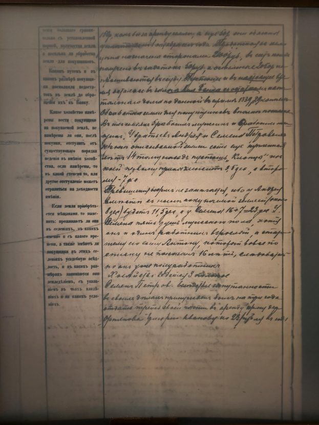 Как сказано выше, вся описываемая пустошь была куплена Петровыми и Дмитриевыми от крестьянина Устинова с переводом дома Виленскому банку. Владели они этою землею: Петровы — лет 11, а Дмитриевы – 8; и в прошлом 1905 году за невзнос платежей были на торгах, и по какой-то странной случайности не вовремя получили (а именно уже после продажи с торгов их земли) последнюю повестку, и земля их продана была нынешнему продавцу земли Королеву с торгов за 1801 рубль и около 100р расходов по сов. данной, всего за 1901 рубль. Потеря этой земли для них могла оказаться роковой, и вот они усиленными просьбами уговорили нового владельца продать им их же бывшую землю, заплатили ему около 200 руб деньгами, из которых зачтены продавцом по новому арендному условию, копия коего в деле, 150 руб, как бы за аренду земли, а еще 50р они обязаны уплатить к 1 октября сего года. Продажная же земли цена назначена сторонами 2100 руб., в счет коих получено в задаток 50 руб., а остальные 2050 руб. напрашиваются в ссуду. Пустошь и в настоящее время осталась в залоге Виленского банка с остатком капитального дома по данной в сумме 1339.29 копеек. Обработка земли для покупщиков вполне посильна. В их семьях 5 рабочих мужчин и 6 рабочих женщин. У братьев Андрея и Семена Петровых кроме описываемой земли есть еще купленная лет 14 тому назад пустошь «Клопцы», из коей первому принадлежит 3.5 десятин, а второму – 7 десятин.