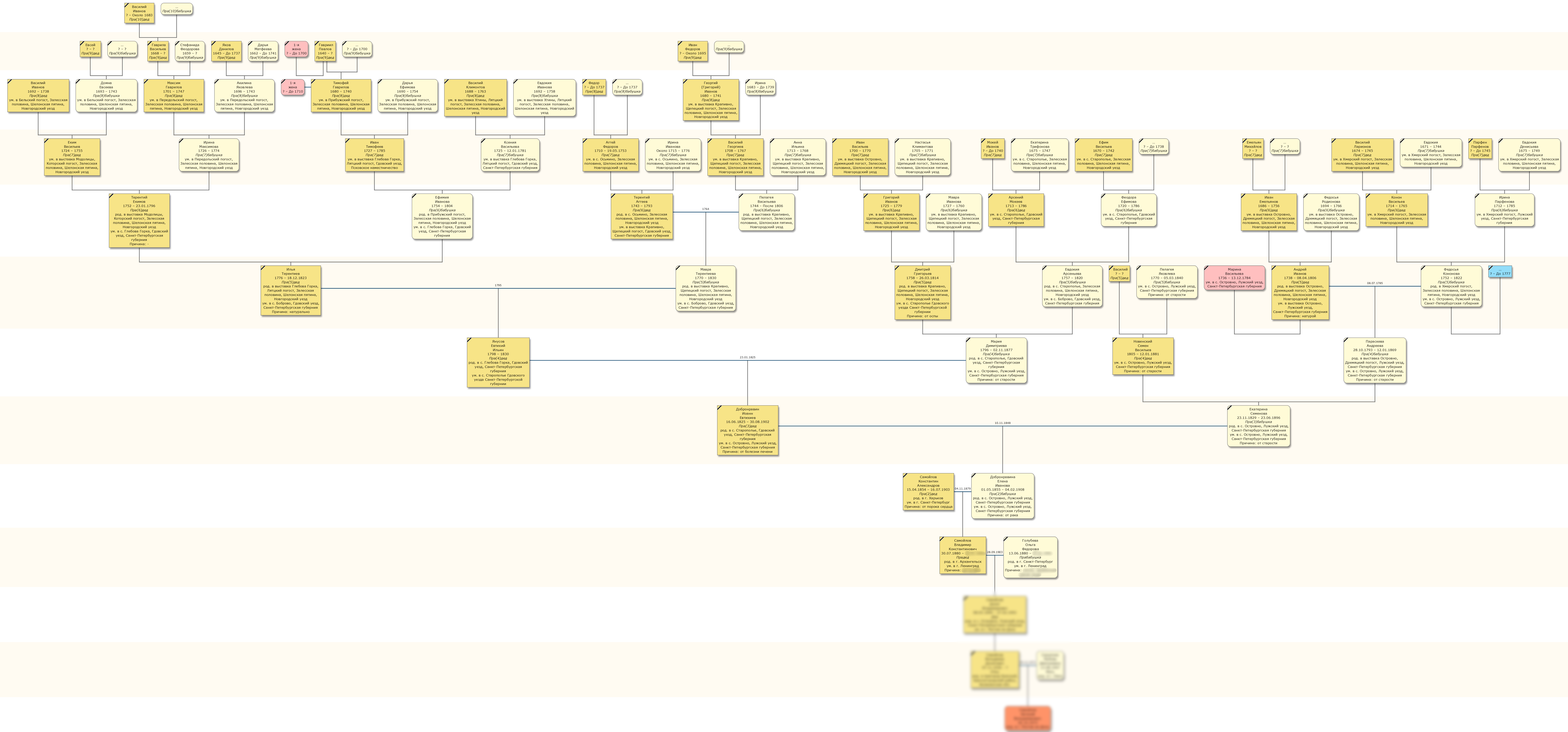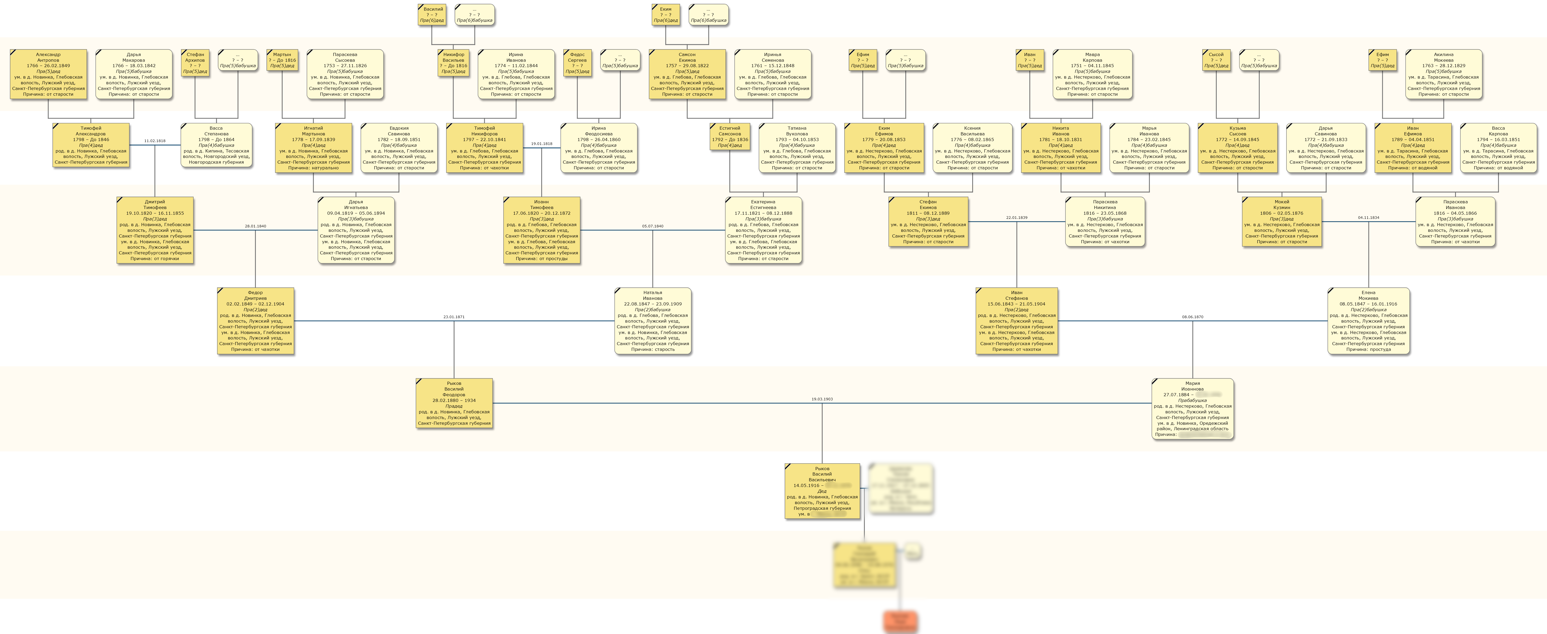Типичный пример стандартного исследования «на 100 лет», выполненного в максимальном варианте. Исследованы 4 поколения крестьян лужского уезда, документальный период с 1816 по 1924 годы. Стояла задача исследовать только прямую мужскую линию максимально полно, но поскольку семьи жен оказывались из того же церковного прихода, были дополнительно расписаны и их ветки.
