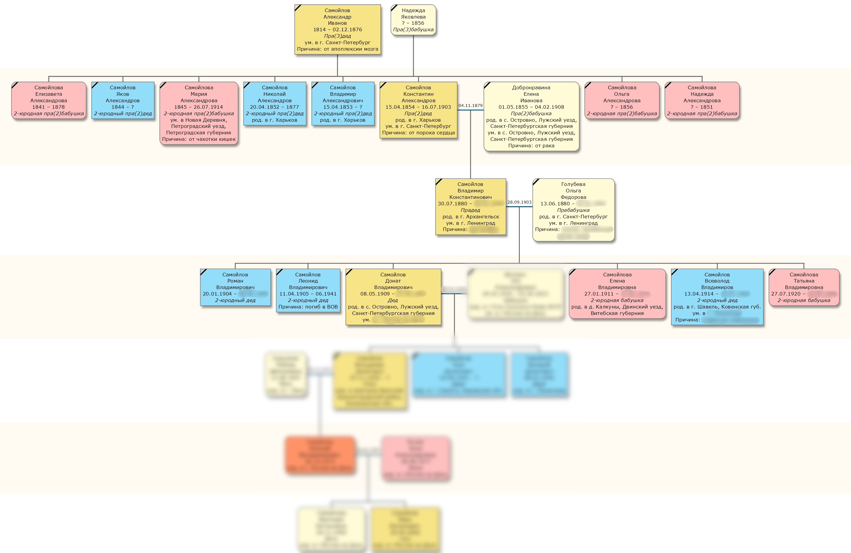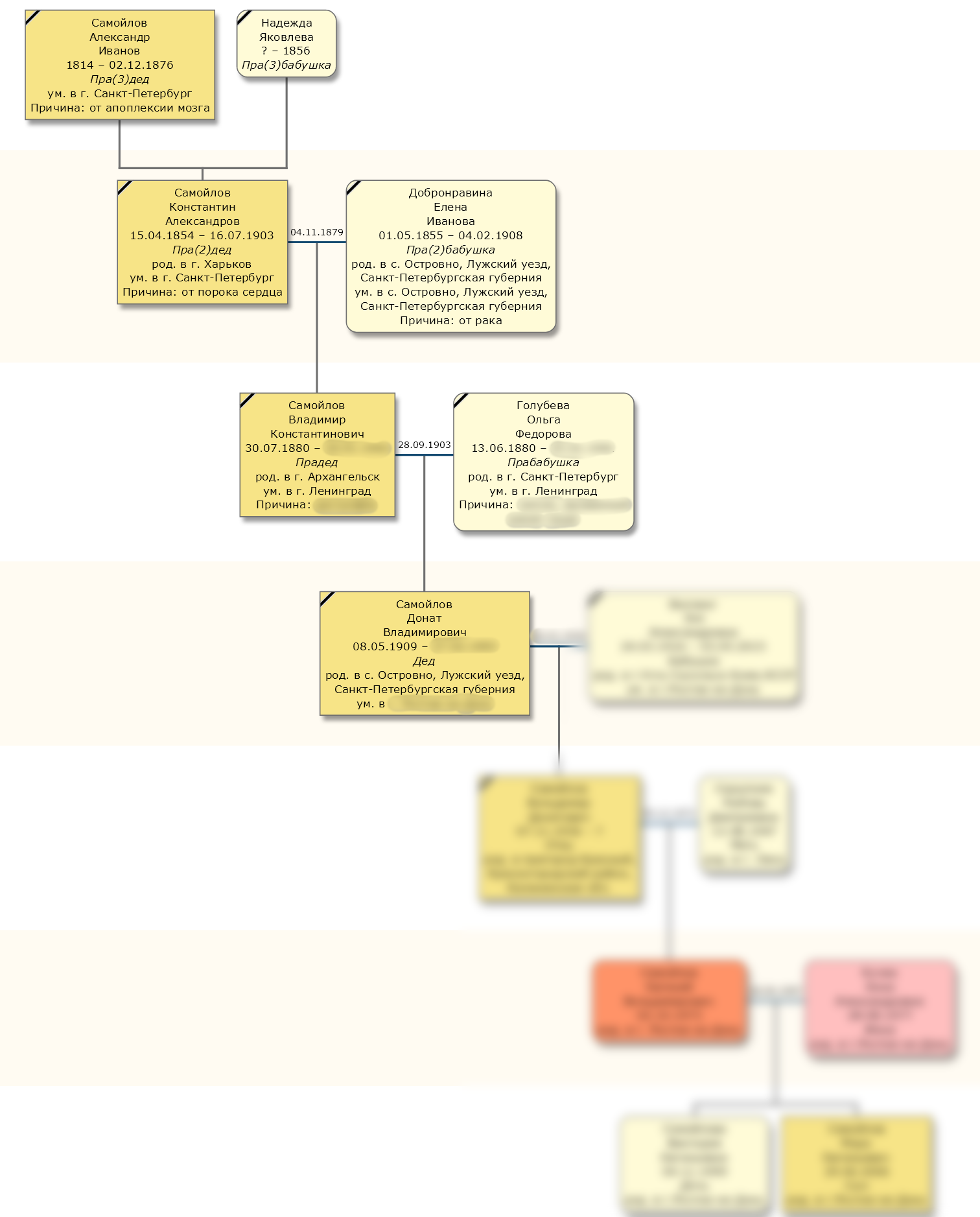 Исследованы 4 поколения (1 купеческое, 1 мещанское и 2 поколения служащих), документальный период – с 1852 по 1960-ые годы. Стояла задача максимально подробно и глубоко исследовать семью.
